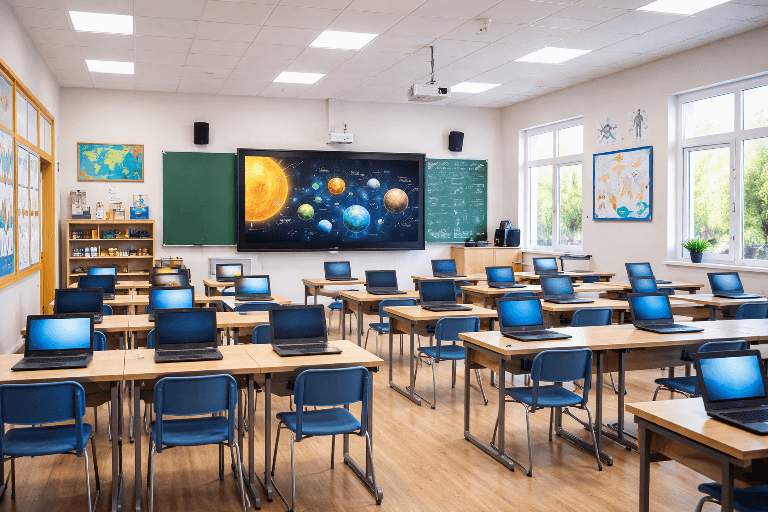 Digitally enabled classrooms with interactive boards and surveillance for effective learning.